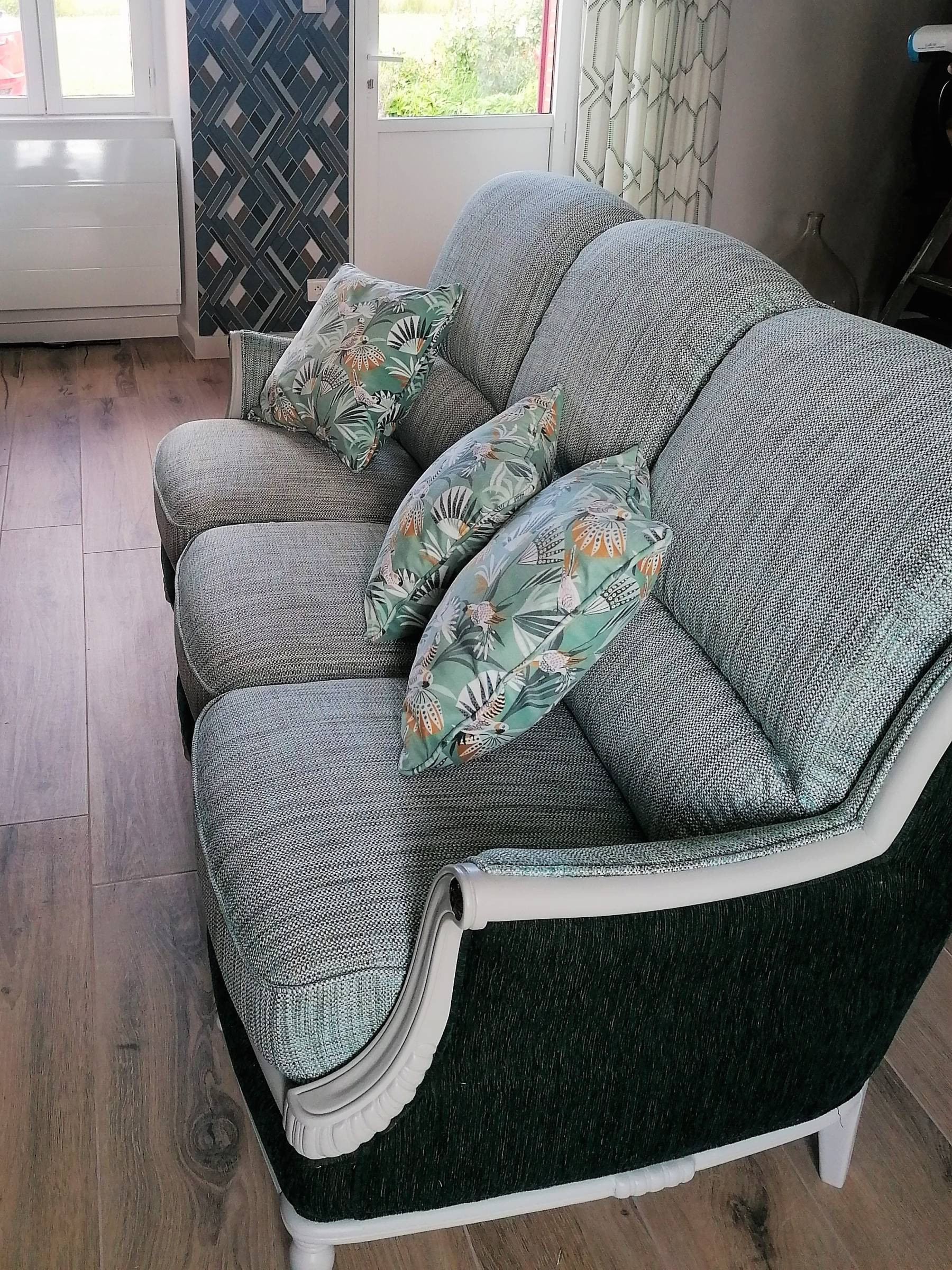 Couverture d'un canapé et confection de housses à platebande, Tissu d'ameublement de chez Camengo, collection Glencoe lagon (réf.14600761), pour les coussins : collection Quetzal velvet bleu (42080135)